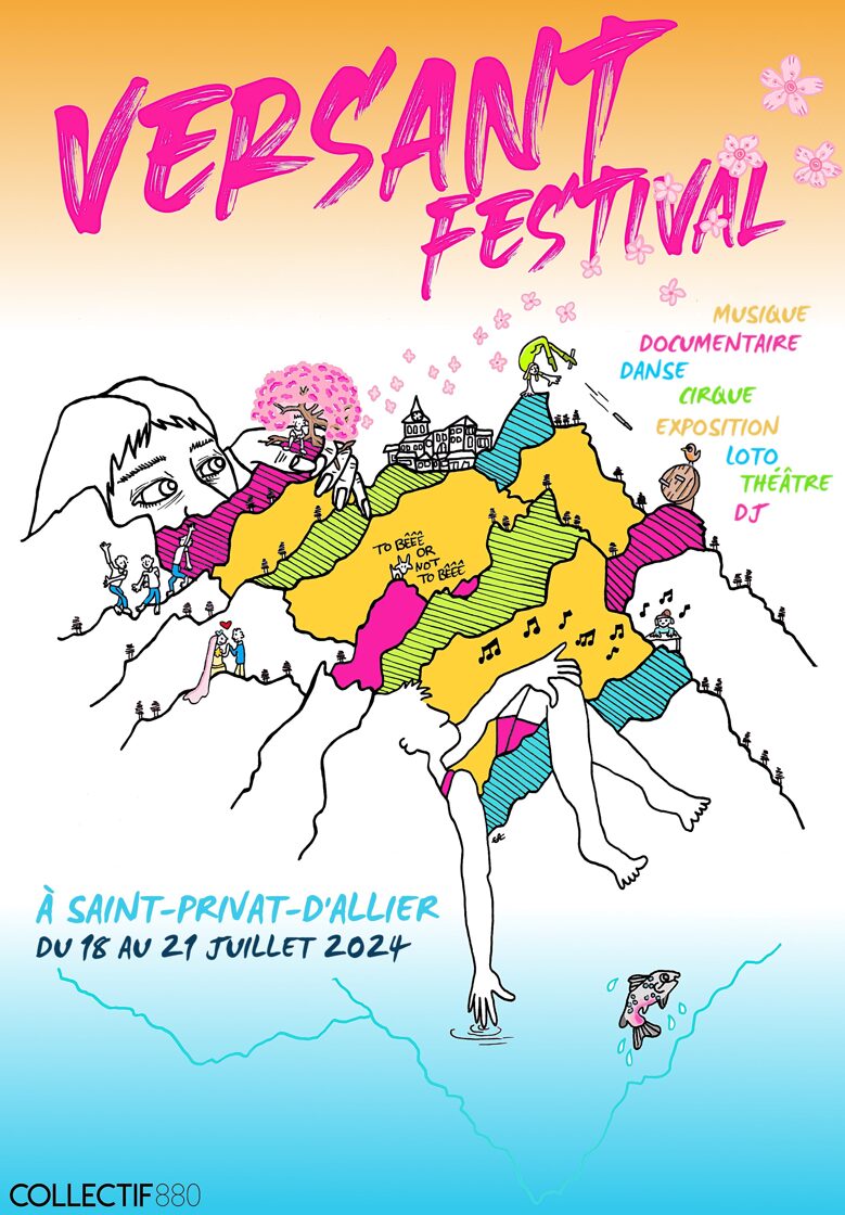 Voici l'affiche que j'ai réalisé pour le Versant Festival qui aura lieu du 18 au 21 juillet 2024 à Saint-Privat-D'allier (Département de la Haute-Loire)