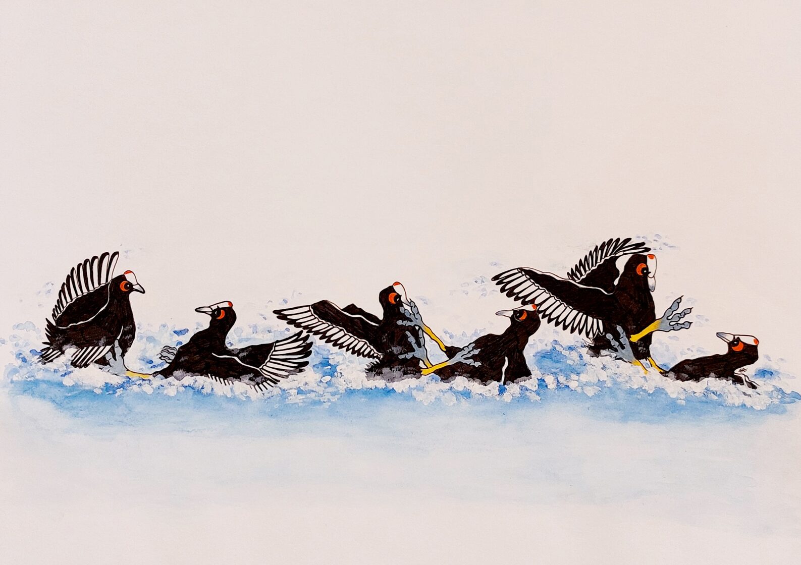foulque / aquarelle, peinture, crayon et stylo / 29,7 x 42 cm / 2024 -